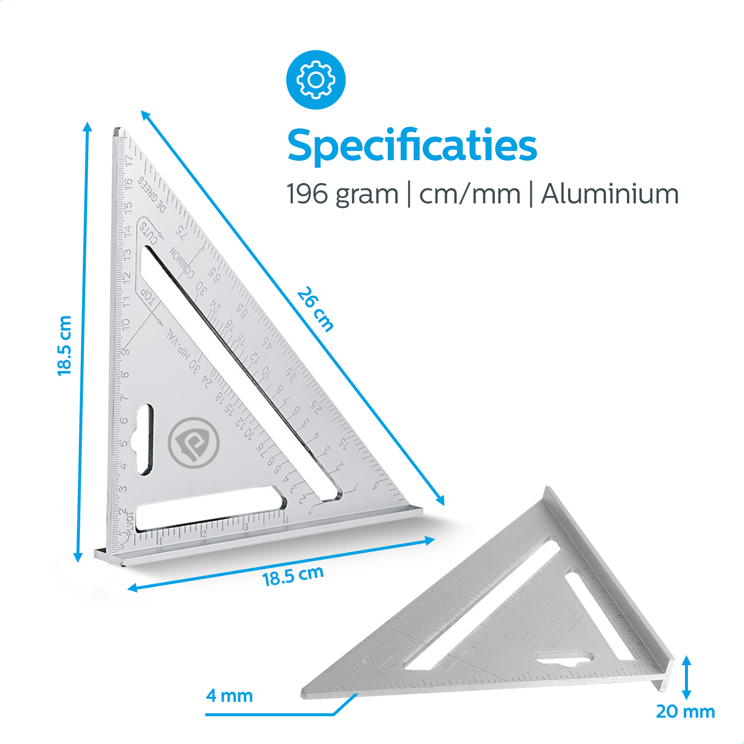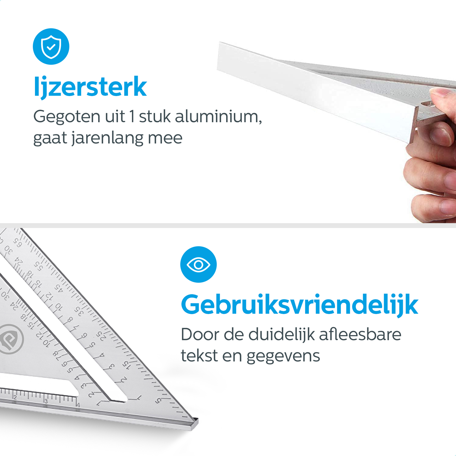 De winkelhaak is gemaakt van sterk aluminium en gebouwd om jarenlang mee te gaan. Gebruik hem gerust als zaaggeleider – de aanslagrand zorgt ervoor dat je hem strak tegen het materiaal kunt leggen. Zo blijft de winkelhaak op zijn plek en voorkom je beschadigingen, zelfs bij gebruik onder een zaagmachine