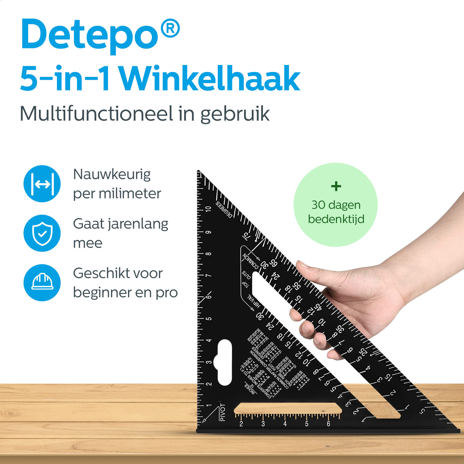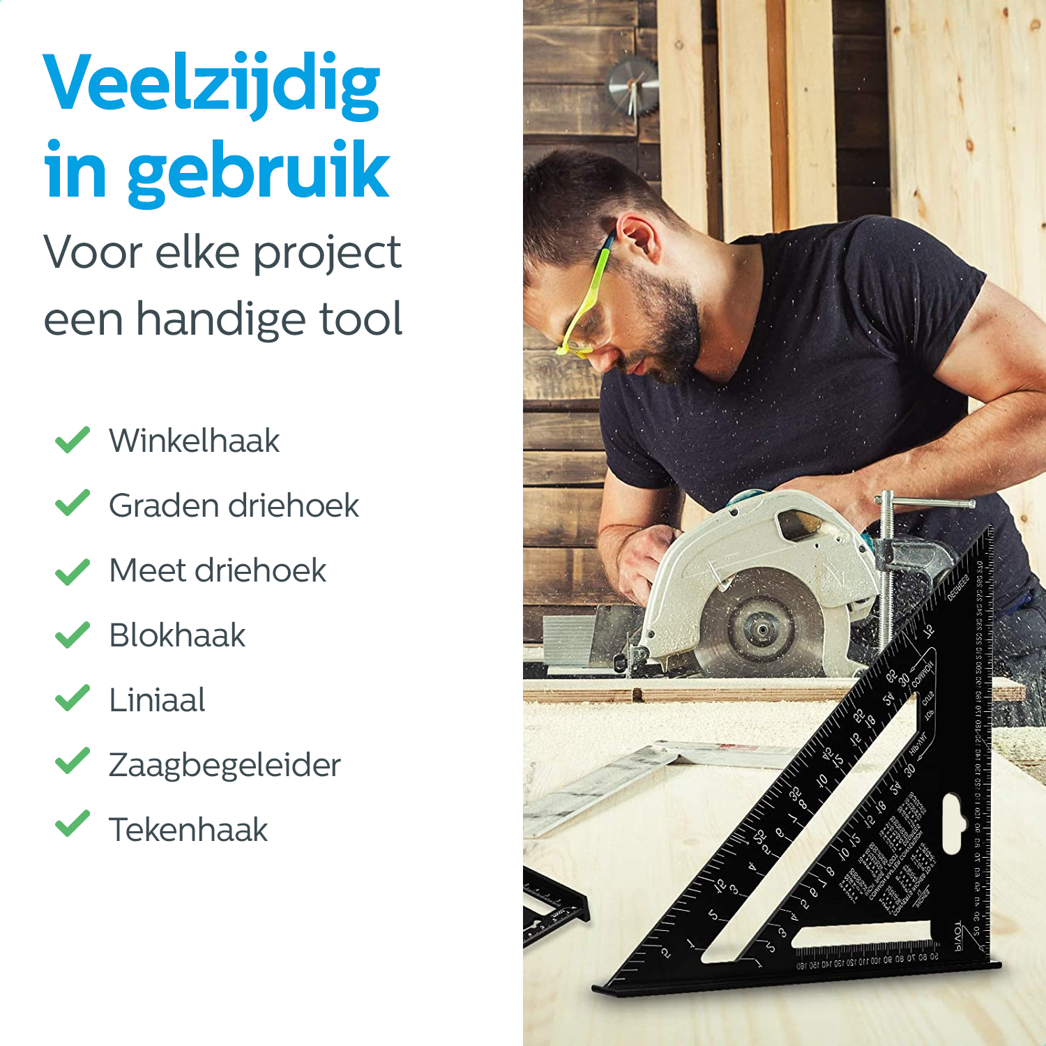 Deze winkelhaak mag niet ontbreken in de gereedschapskist van elke doe-het-zelver of professional. Dankzij het 5-in-1 ontwerp gebruik je hem als winkelhaak, graden driehoek, meet driehoek, liniaal, blokhaak en zaaggeleider. Perfect voor meten, markeren, tekenen en zagen.