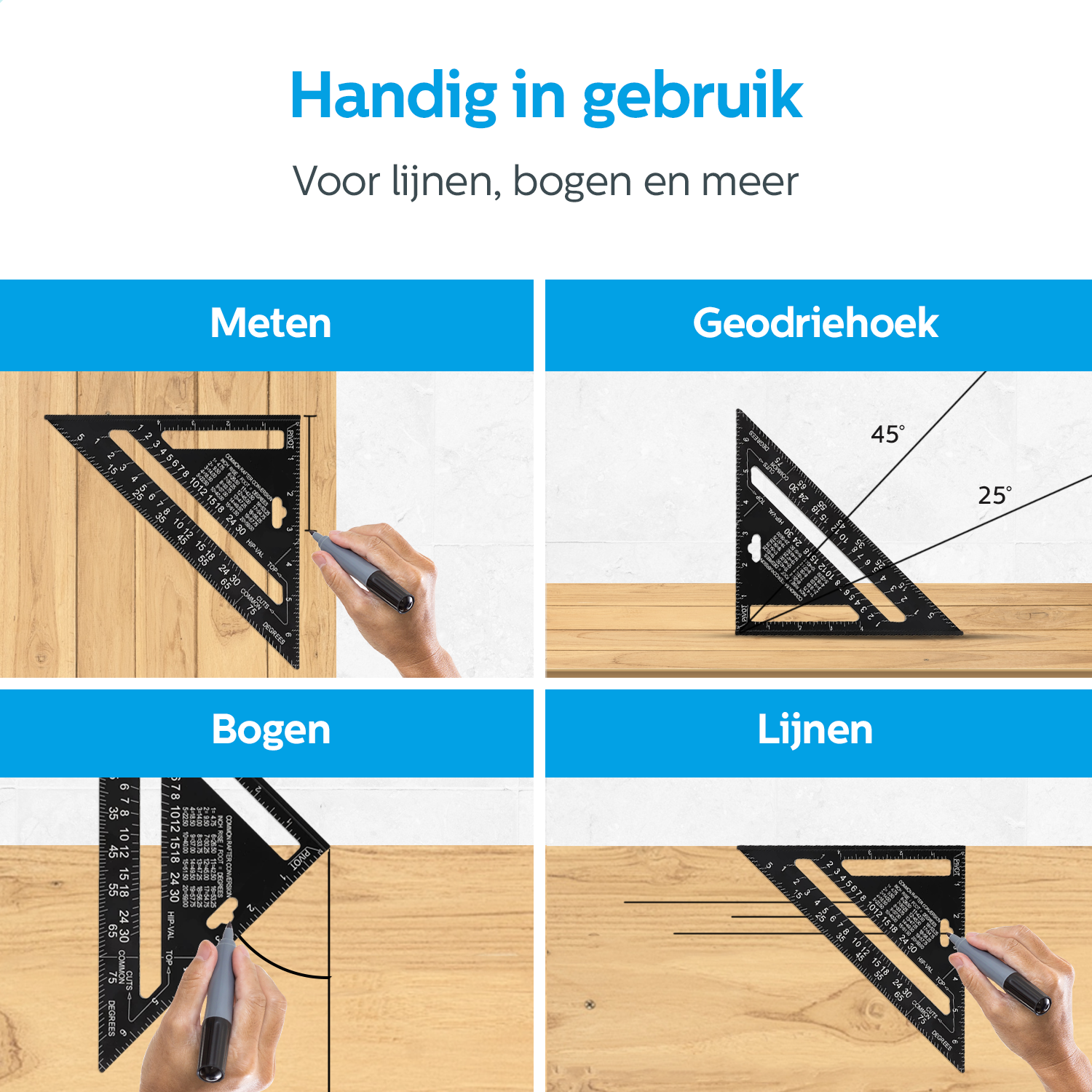 Winkelhaak - Timmerman Meet Driehoek - Blokhaak gemaakt van Metaal - Schrijfhaak - Speed Square - 5 in 1 Gradendriehoek - Zwart