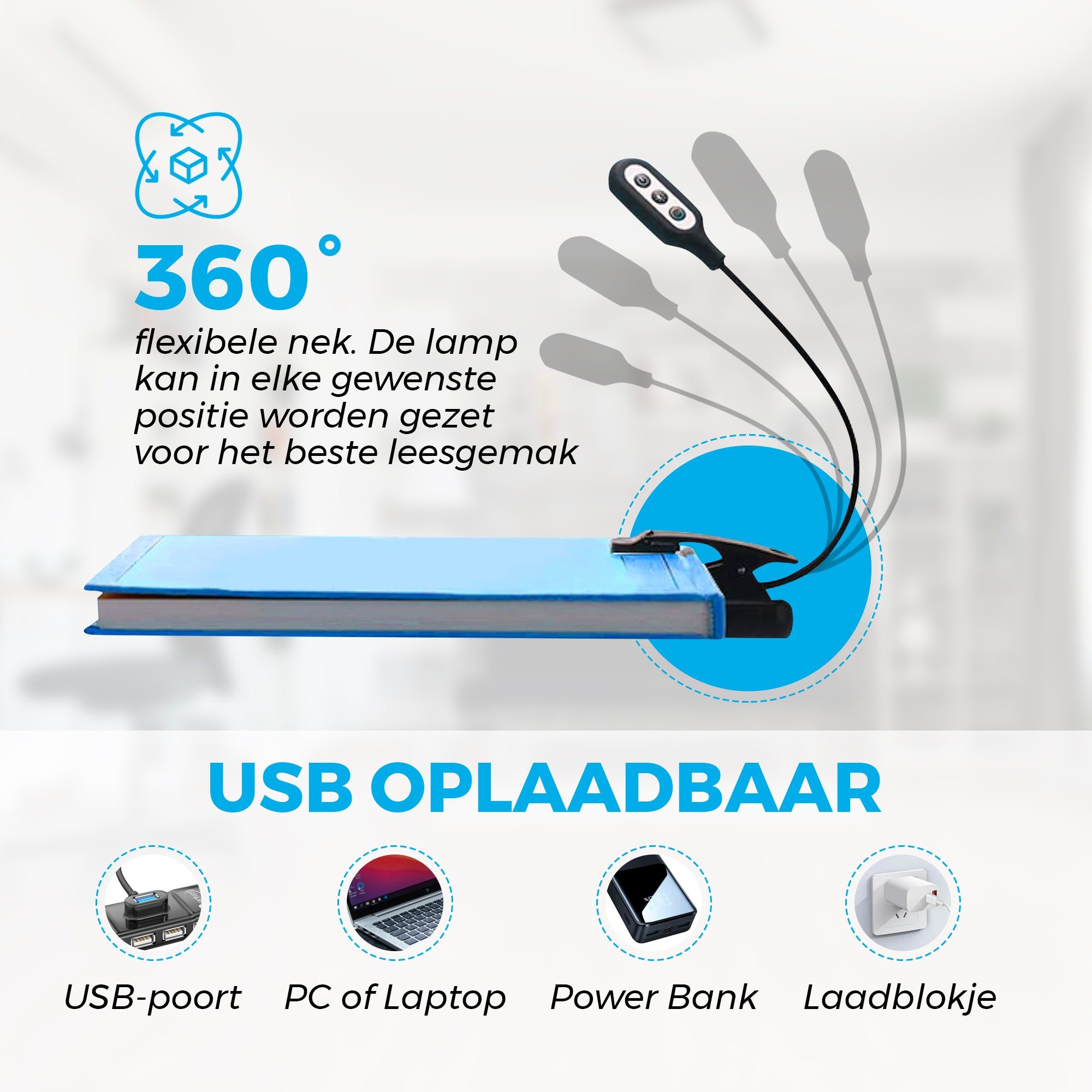 Leeslampje voor Boek - LED Leeslamp met Klem - Verstelbare Flexibele Arm - voor Boek / Slaapkamer / Bed / Kind / Bureau - USB Oplaadbaar